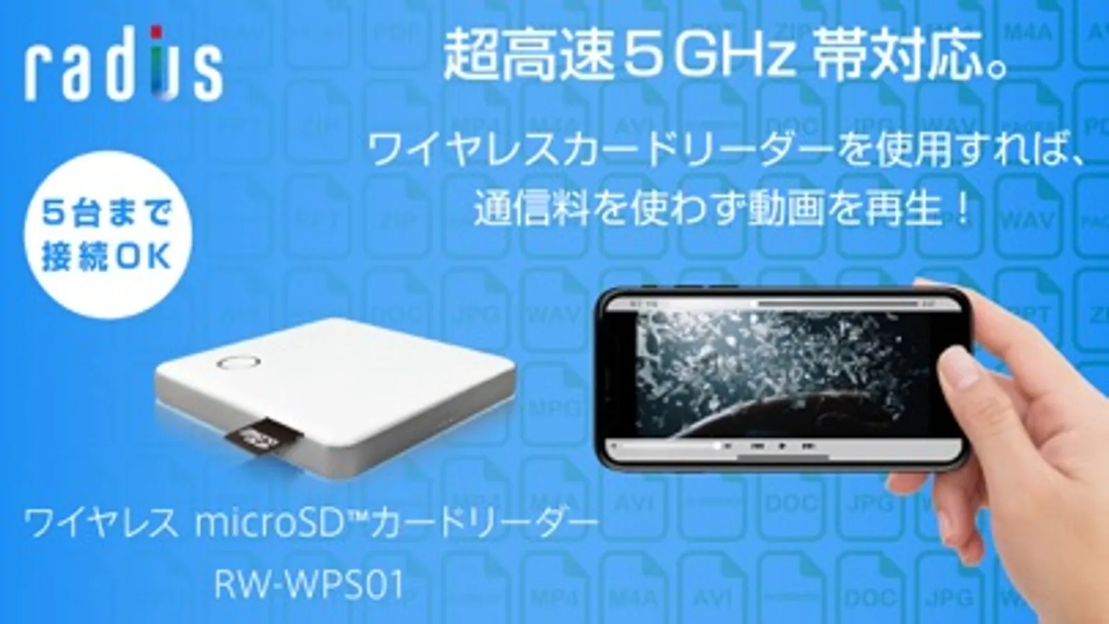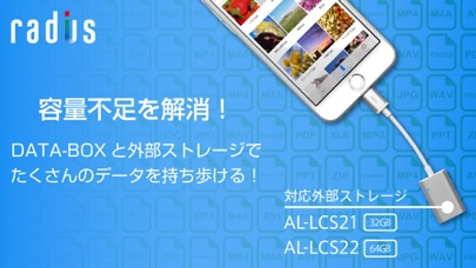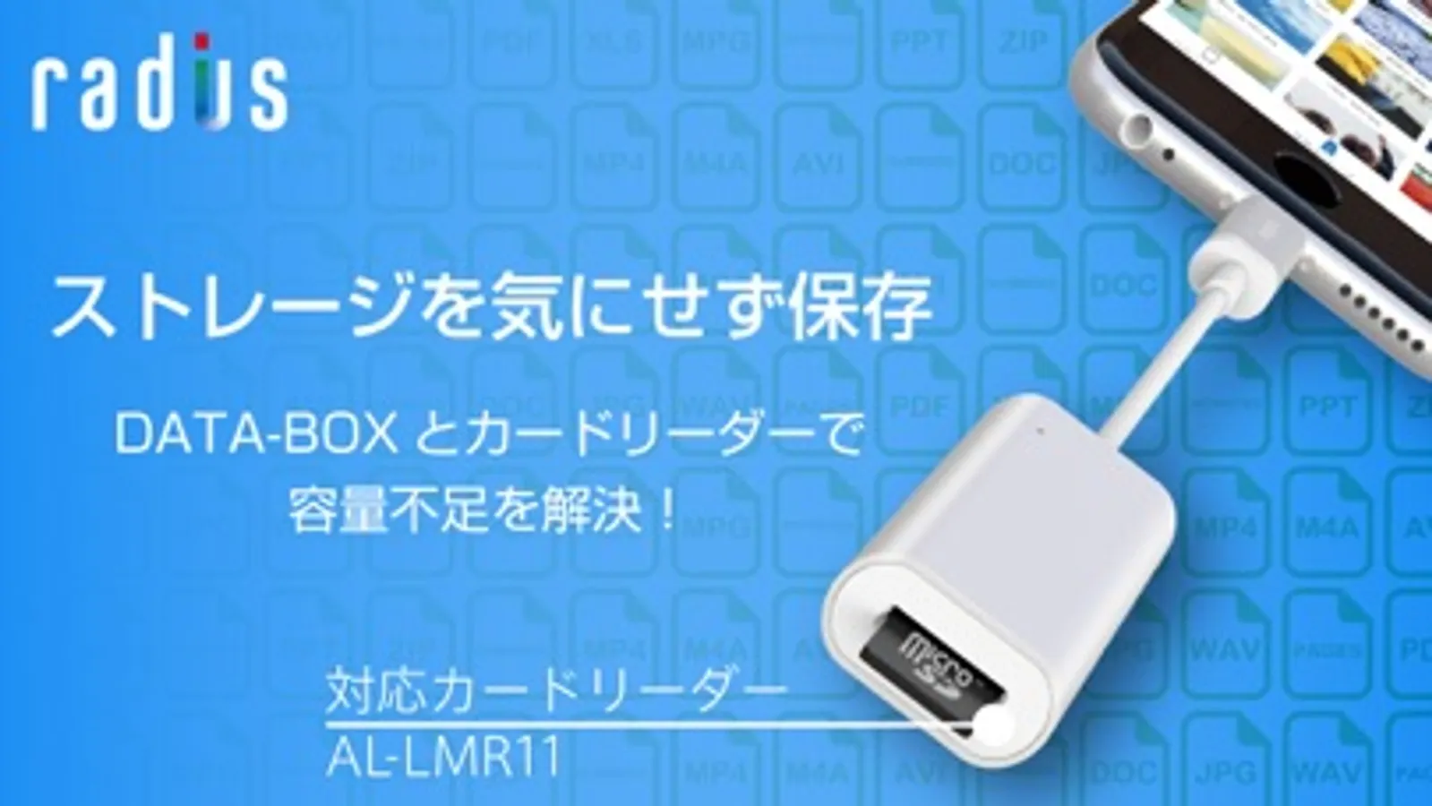 DATA-BOXはラディウスのワイヤレスカードリーダー(RW-WPS01/11)、カードリーダー(AL-LMR11)、外部ストレージ(AL-LCS21/22)と合わせて使用できるファイル管理アプリケーションです。