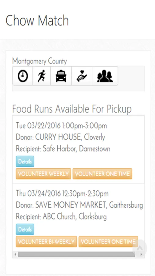 The Chow Match App uses matching logic to connect donated surplus food with organizations. Food donated by restaurants, super markets, caterers, farms, and other businesses is distributed to agencies and organizations such as family shelters, homeless shelters, neighborhood feeding programs, churches, schools, 100% affordable housing programs, and many other outreach programs.