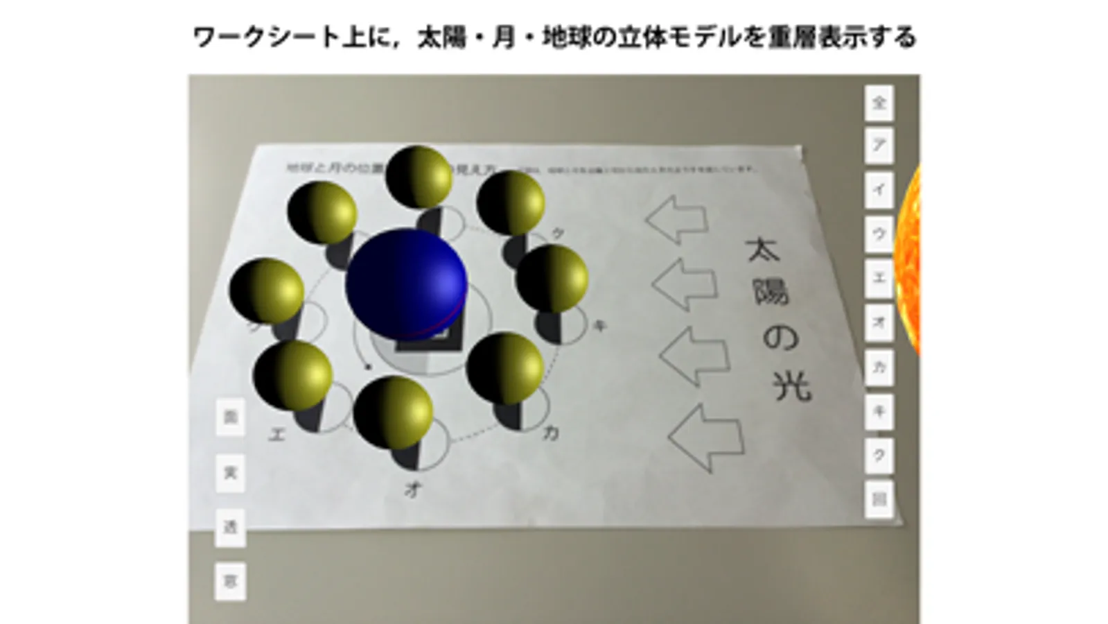 It is very difficult to view the waxing and waning of the moon in a plane view. Therefore, we superimposed a 3D model onto a plan view (hereafter worksheet) from which you can view the sun, moon, and earth from the North Pole. By moving the tablet to the observation point, you can investigate how the moon waxes and wanes.