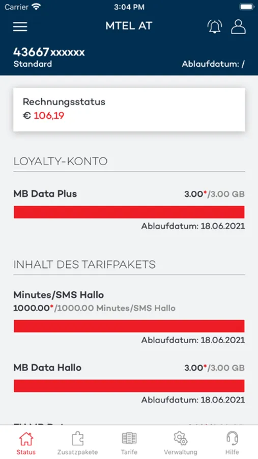 - Einsicht über die verbleibenden Freieinheiten (Minuten, SMS, Datenvolumen) im aktuellen Verrechnungszeitraum