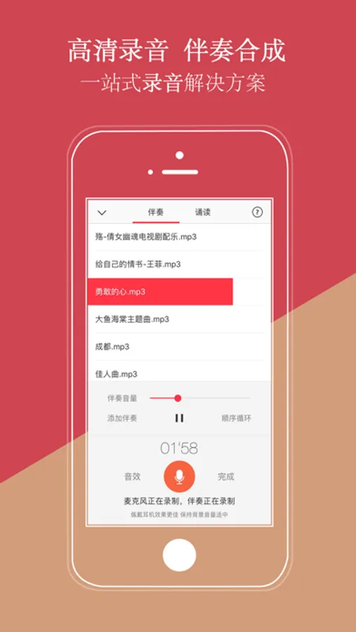 ● 支持给已有的录音文件合成伴奏,自由控制伴奏;