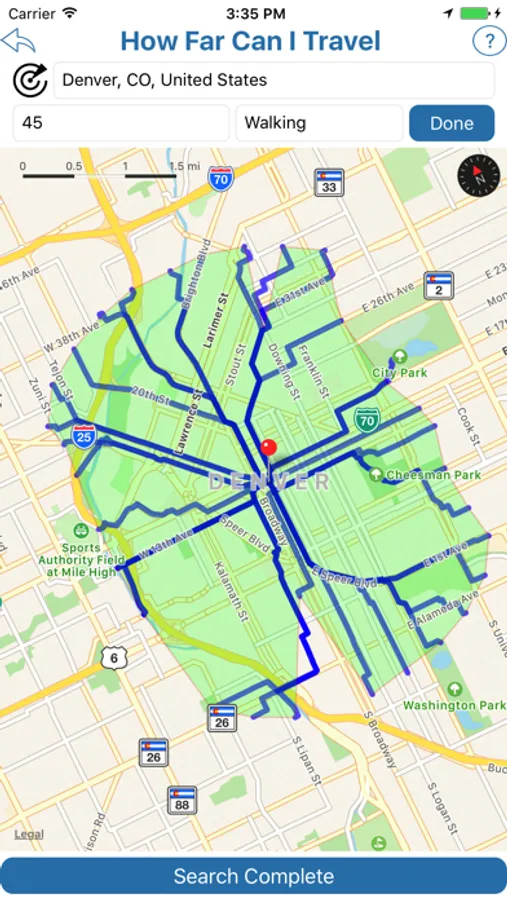 The Find How Far I Can Travel tool will show how far you can drive or walk within a set time. For example, how far can I get if I drive for 60 minutes from my current location.