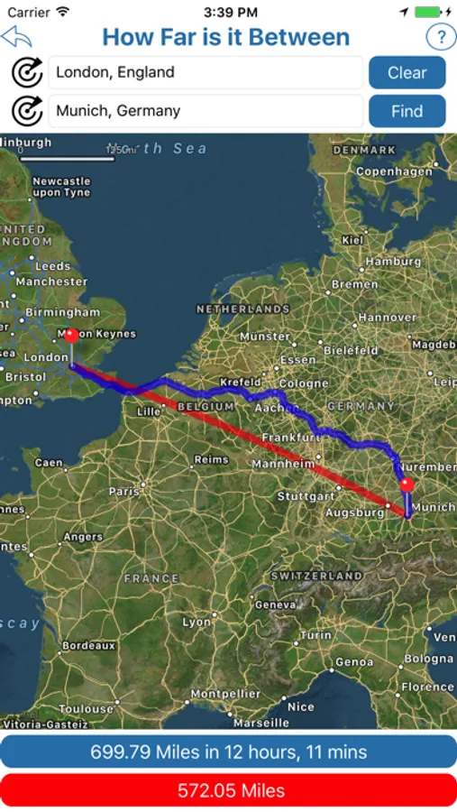 How Far is it Between allows you to find the road and crow-flies distance between 2 addresses. It also shows both routes on the map.