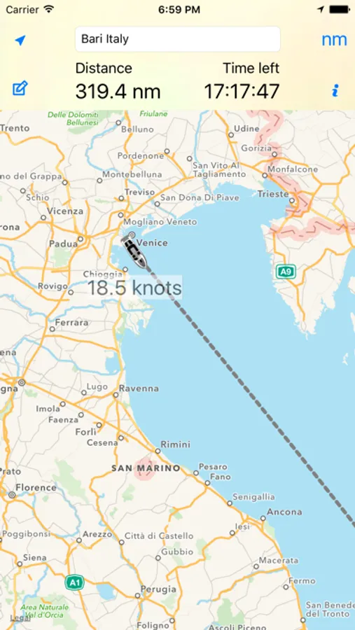 Cruise Nav uses GPS signals even while in Airplane Mode to display your position, estimated distance, and time to your destination. Distances are expressed in Kilometers or Nautical Miles.