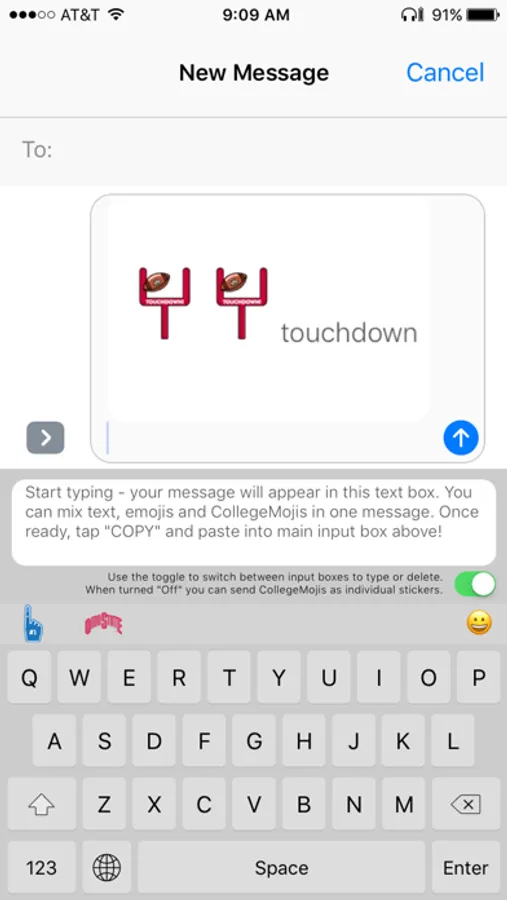 The Collegemoji Keyboard application includes our OneText(TM) capability which will allow you to send a group of emojis and text as one message and for recipients to receive it as one message, improving the overall texting experience and saving you and your friends valuable data costs.