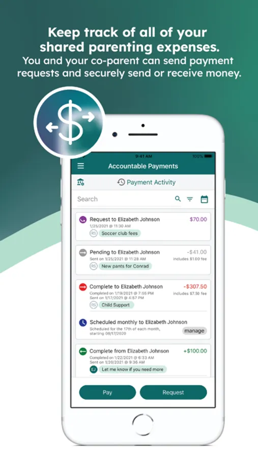 ACCOUNTABLE PAYMENTS: co-parents can keep track of all shared parenting expenses, easily making payment requests and securely sending or receiving money.