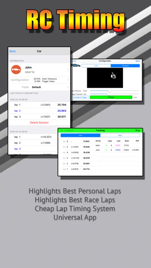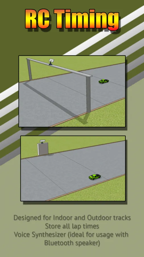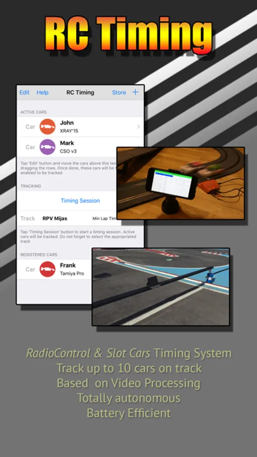 RC Timing is an App that tracks lap times for radio-control and slot cars. It can be used in both indoor and outdoor tracks.