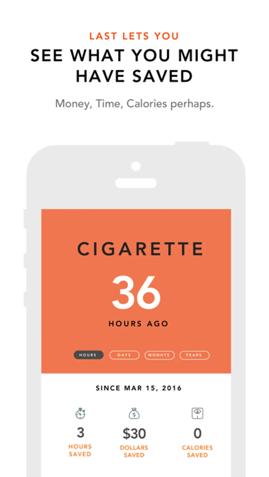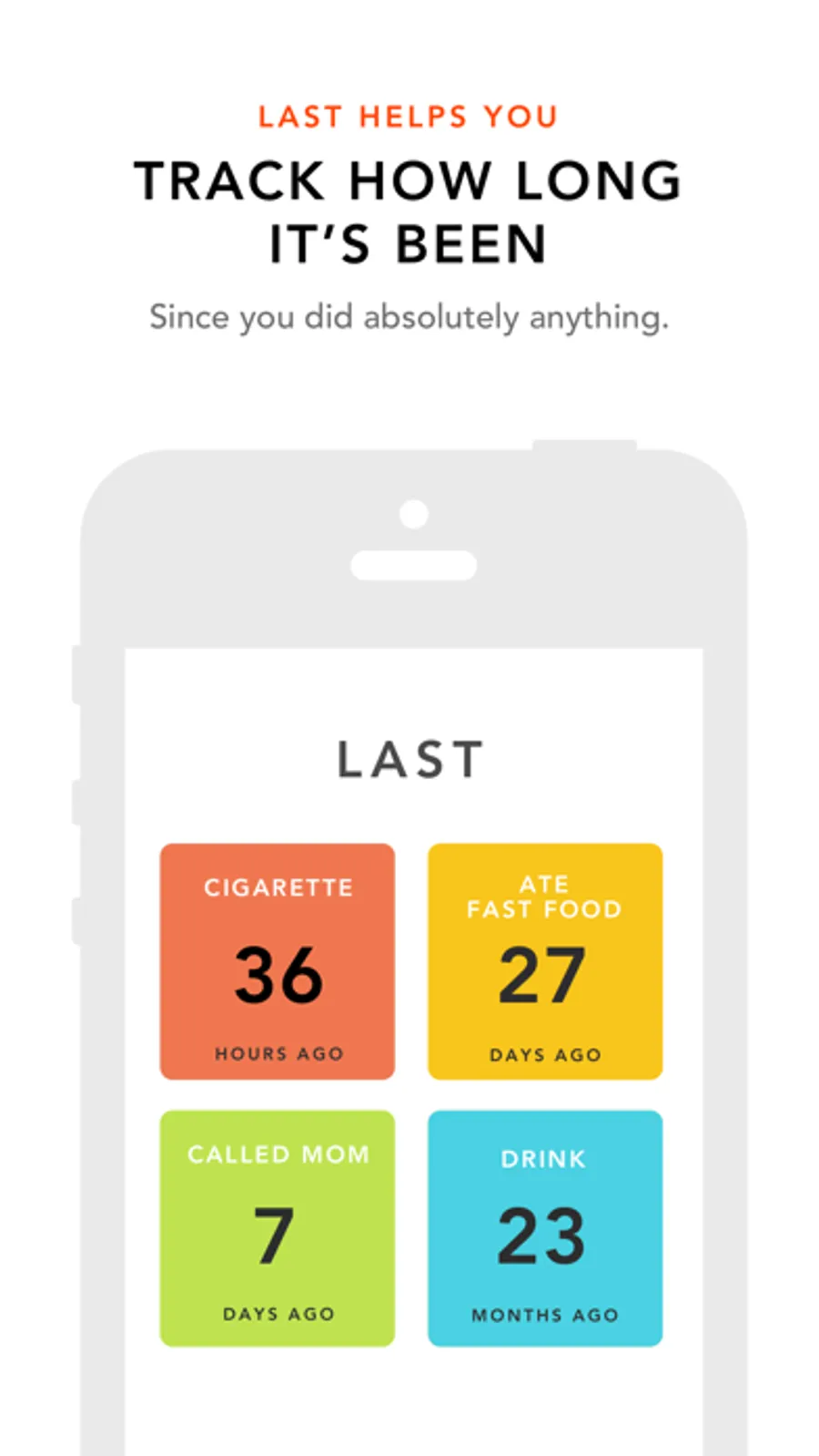 If you're trying to quit a bad habit, LAST is a tool to help you stay quit. It shows you exactly how long it's been since your LAST cigarette / drink / cookie / soda / tv binge / impulse buy / anything.