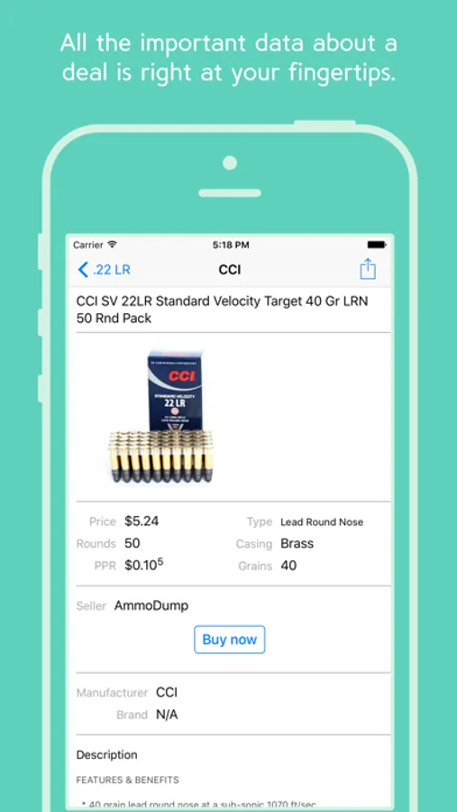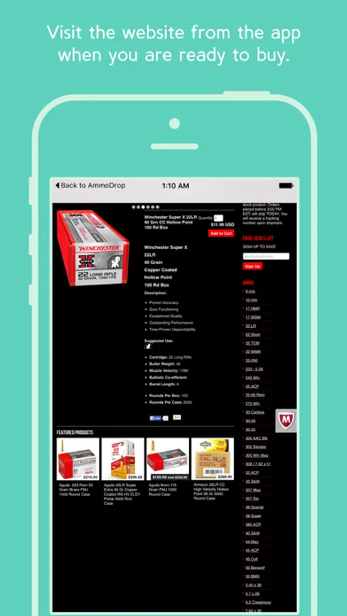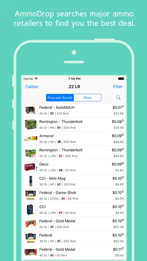 AmmoDrop searches the web for the best prices on ammunition. Quickly filter and sort through thousands of listings to find a great deal. All the important data about a deal is extracted and presented in a clean, modern format. Visit the seller's website from the app when you are ready to make a purchase. You can also easily share a great deal you found with a friend or on social media!