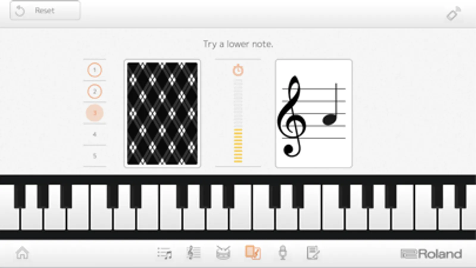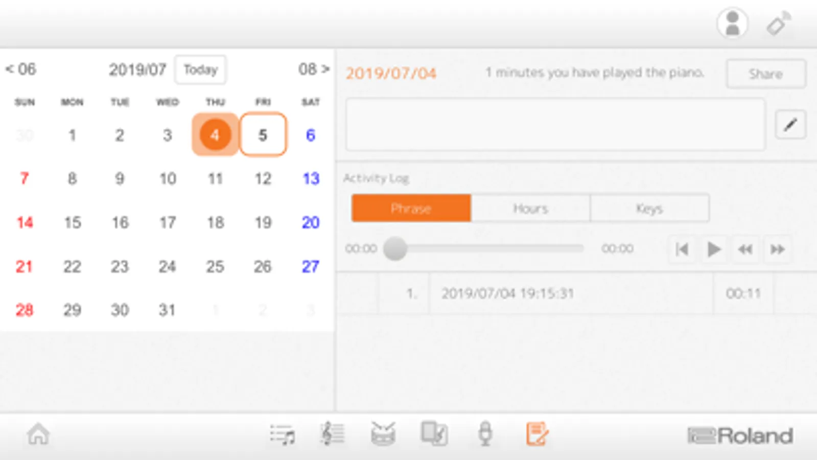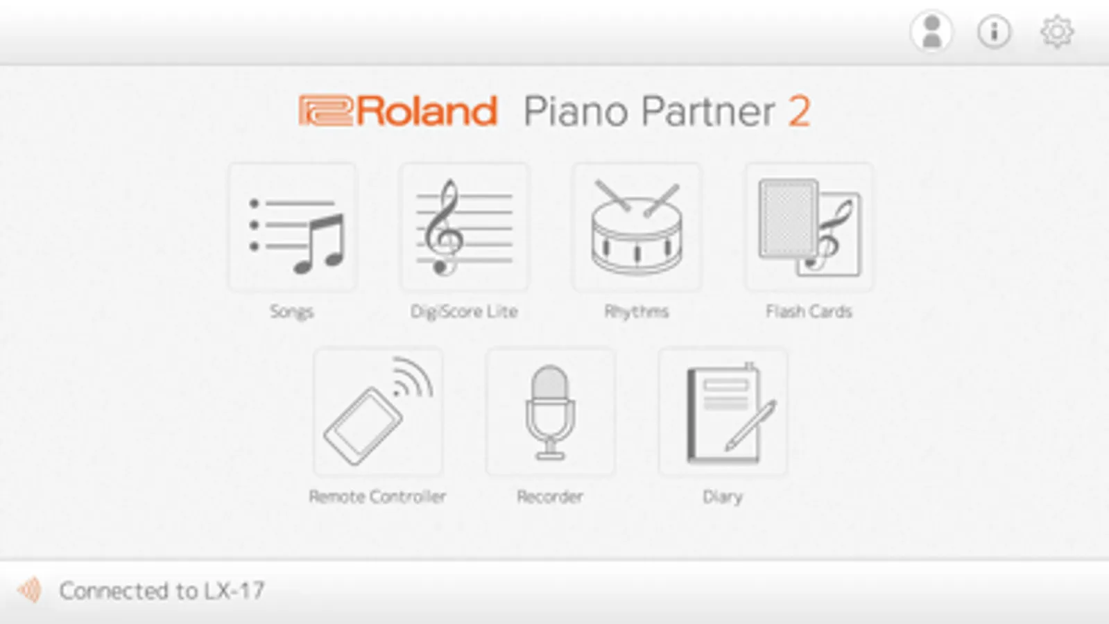 Recorder and Diary functions help you progress more quickly, allowing you to evaluate performances and keep track of your daily practice activities. The Diary logs stats about playing time, which keys you played, and more, and it’s even possible to share them with your family, friends, and teachers directly from the app. To use Piano Partner 2, connect your device and a compatible Roland piano wirelessly via Bluetooth®, or wired with a USB cable.