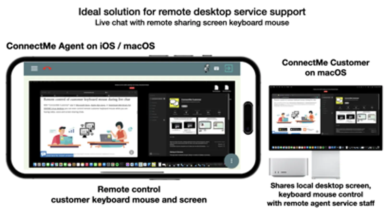 With “ConnectMe Customer” app in Apple Mac App store gets installed on customer desktop, you can even control remote customer keyboard mouse while you are having video, voice and screen sharing chats.