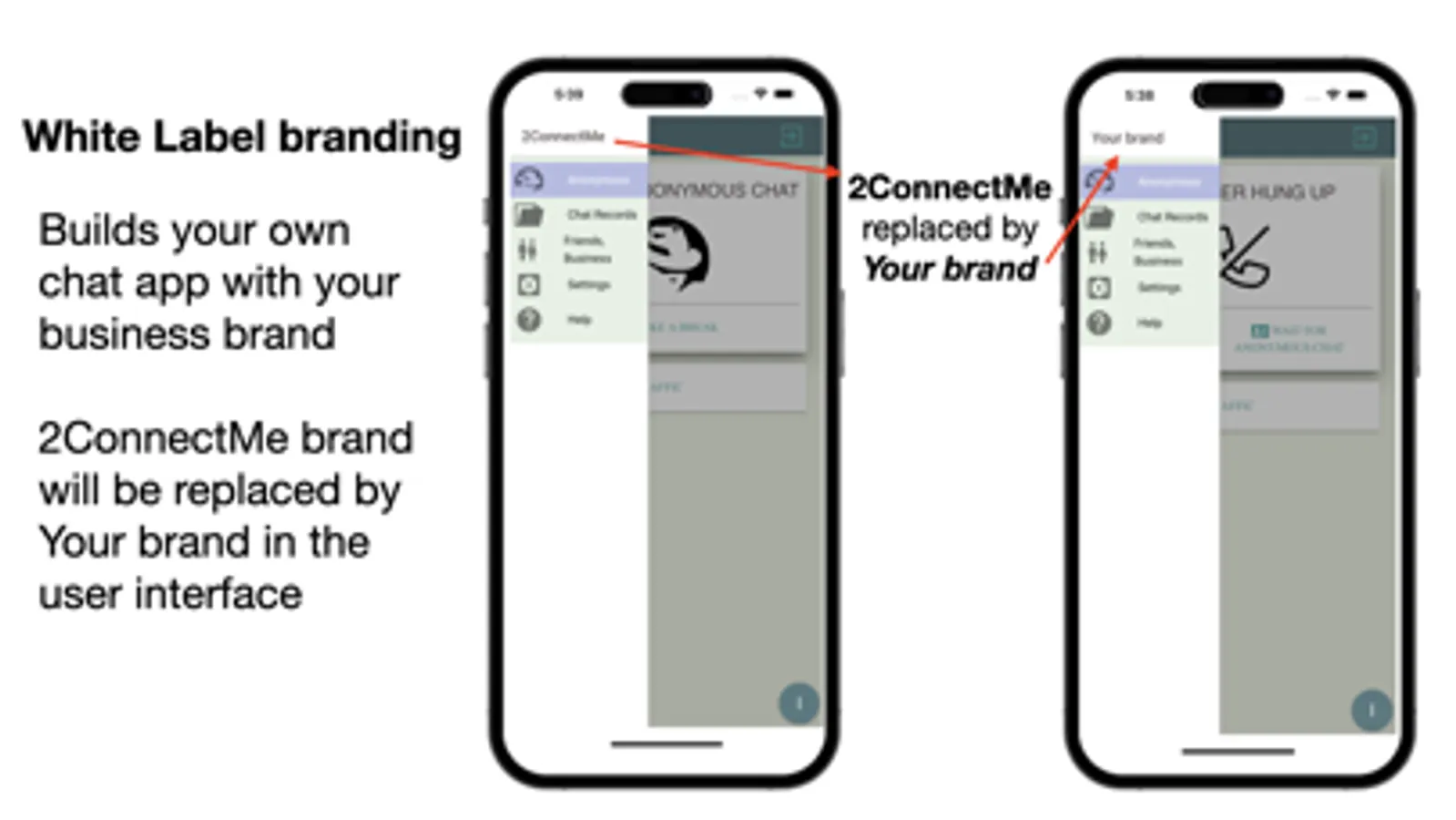 Replaces almost all “2ConnectMe” brand in the app user interface by your own brand and works under your custom domain.