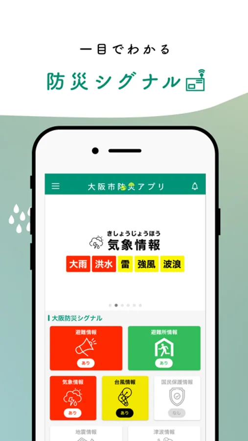 「大阪市防災アプリ」は、災害時の避難所開設状況、プッシュ通知による防災情報の配信、Googleパーソンファインダーを利用した安否連絡、浸水想定マップなどのハザードマップ、