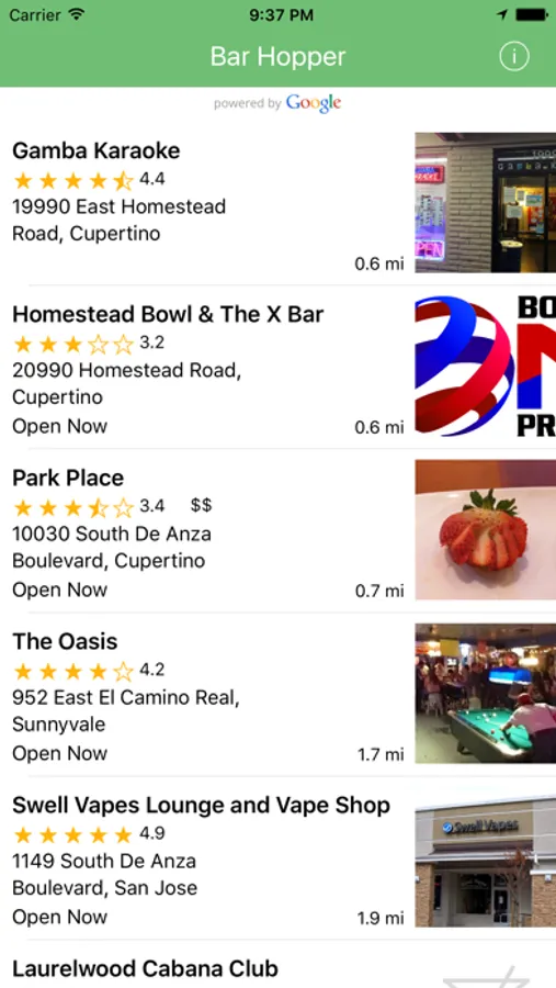 Simply opening the app will provide you with a list of bars ordered by their distance from you. Not only does each item in the list show you the name, review and address, but also shows if they are closed and how far away you are from that restaurant.
