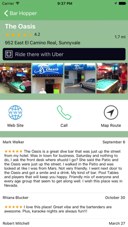 If you want more information about a bar, select it from the list to get the bar's reviews, pictures and more. You can even go to their website, launch your Uber app, or call them directly from the app.