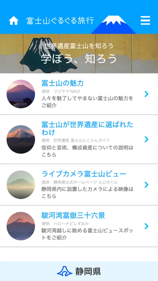 This app introduces websites that have information about Mt. Fuji. Use it to learn about and climb Mt. Fuji plus to enjoy it's surrounding area.