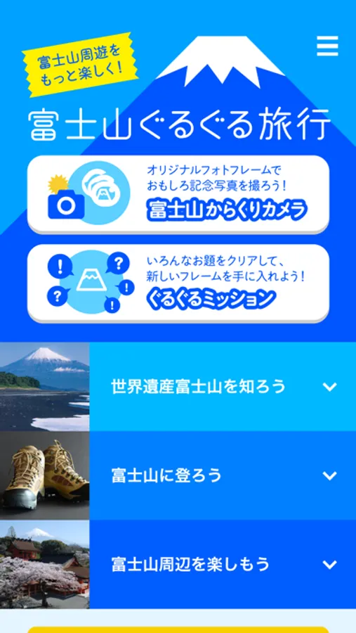 Take on a mission while enjoying a tour of the Mt. Fuji area by visiting specific points/areas and answering quizzes about Mt. Fuji. Enjoy using the photo frame prizes for clearing missions in your photography.