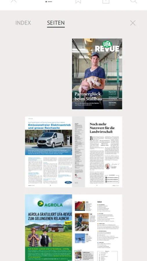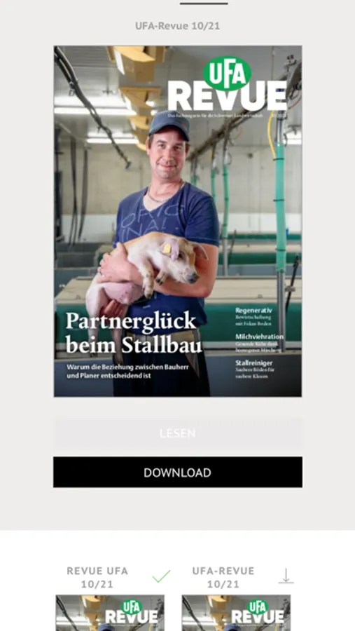 Hier erfahren Landwirtinnen und Landwirte, was sie für ihre tägliche Arbeit auf dem Bauernhof wirklich wissen müssen. Die UFA-Revue ist das meistgelesene Schweizer Agrarfachmagazin und richtet sich an alle Personen, die innerhalb der Landwirtschaft arbeiten. In den Rubriken Pflanzenbau, Nutztiere, Landtechnik, Betriebsführung und Landleben liefert die UFA-Revue praktische Tipps für den landwirtschaftlichen Berufsalltag. Regelmässig erscheinen mit der UFA-Revue Sonderbeilagen zu ausgewählten Themen und Messen rund um den Agrarsektor. Diese Sonderbeilagen sind ebenfalls innerhalb der App abrufbar.
