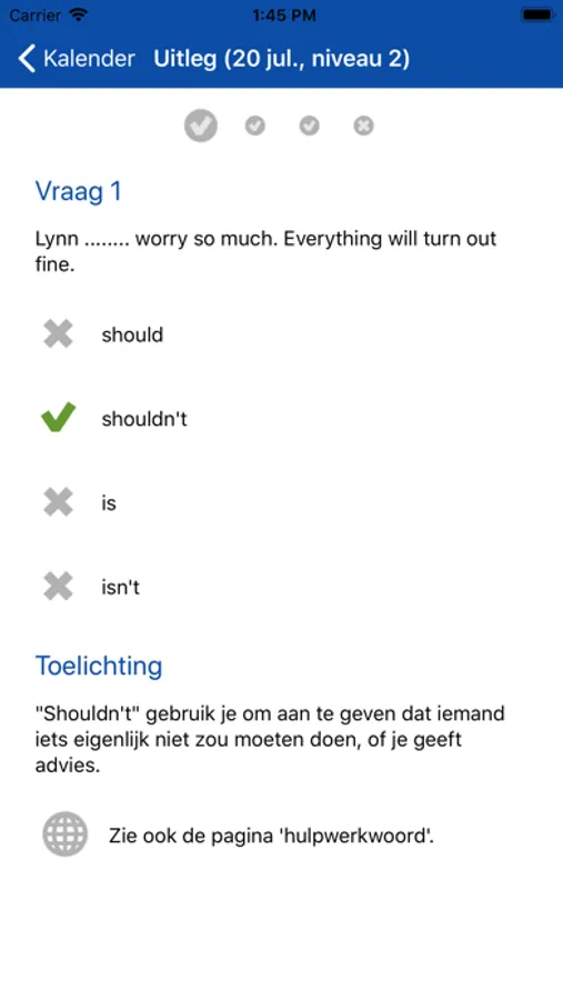 NU Beter Engels: elke werkdag een testje om je kennis van het Engels te verbeteren én te onderhouden. Je ontvangt iedere werkdag vier meerkeuzevragen, en we zorgen ervoor dat je met die vier vragen per dag iedere week een aantal veelvoorkomende zaken kunt oefenen.