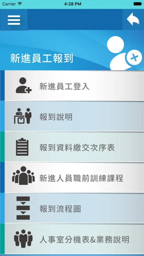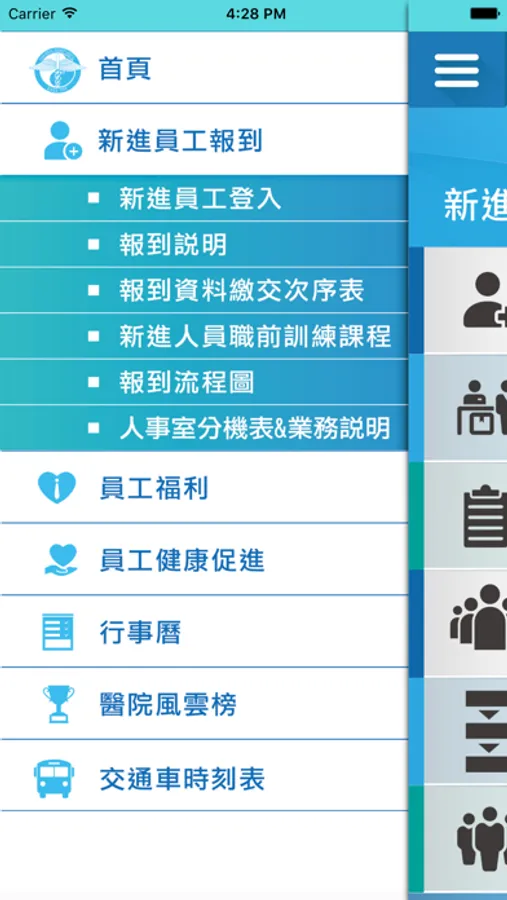 臺中中國醫藥大學附設醫院推動院內員工APP系統,協助新進員工運用網路科技做好報到程序,同時透過APP與醫院連線,內容包含員工健康促進、院內員工交流及員工福利事項等,使員工了解享有之福利並提供貼心服務,本APP可連結行事曆及交通車時刻,隨時查詢院內資訊。