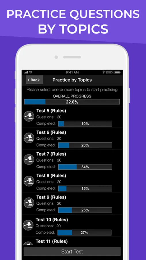 - Track and monitor your progress. Analyse your performance and find out when you have reached test standard.