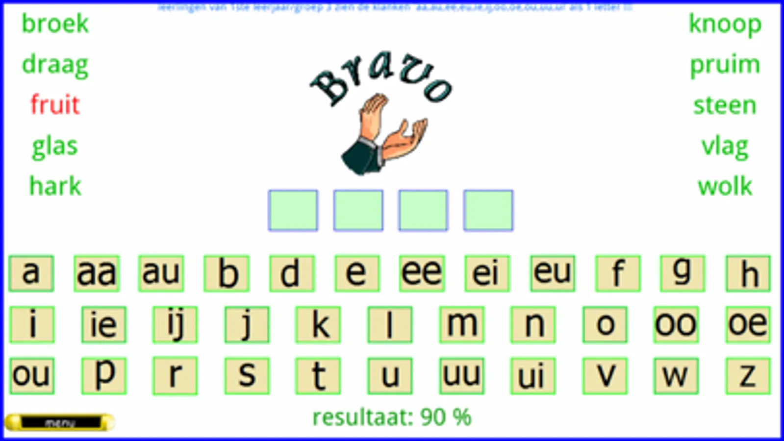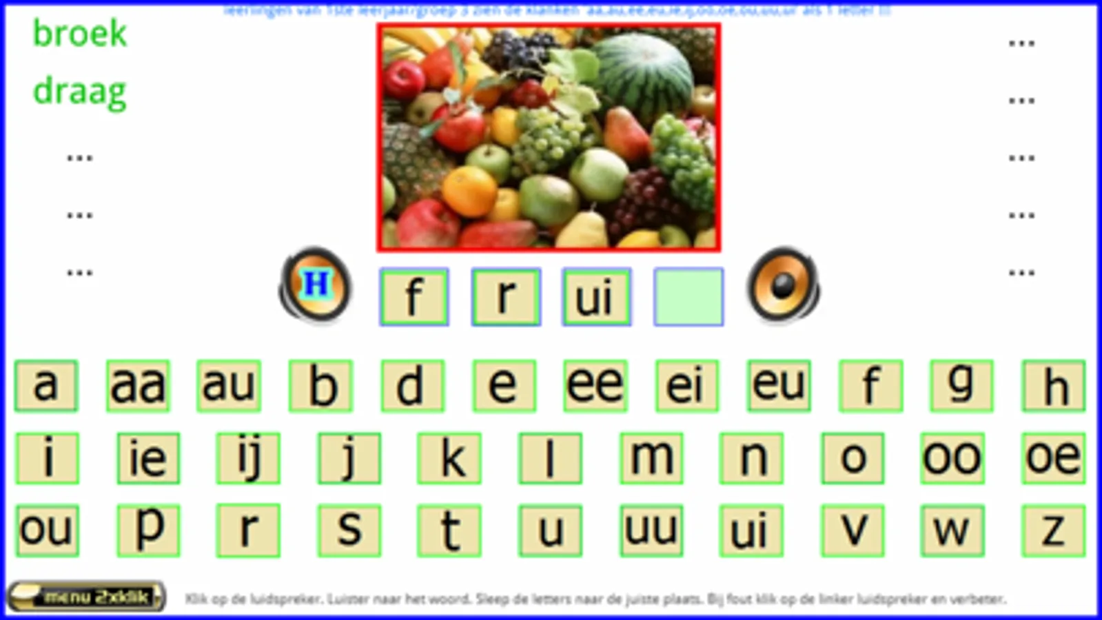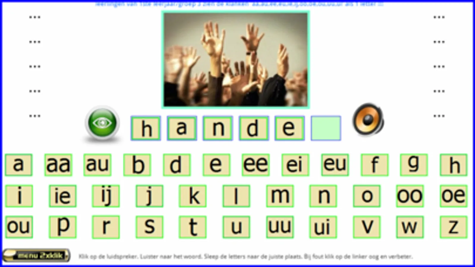 Deze reeks dictee oefeningen volgen de leesmethode Veilig Leren Lezen van uitgeverij Zwijsen (een veelgebruikte leesmethode in België en Nederland). Deze 10 reeksen van elk 10 mmkm-woorden, mkmm-woorden en meerlettergrepige woorden kunnen gemaakt worden vanaf AVI-niveau 3. Klik eerst op de rechter luidspreker en luister naar het woord. Sleep dan de letters naar de juiste vakjes. Bij fout verschijnt een tweede luidspreker. Klik hierop en je hoort het woord met afzonderlijke letters. Verbeter. Leerlingen van 1ste leerjaar/groep 3 zien de klanken 'aa,au,ee,eu,ie,ij,oo,oe,ou,uu,ui’ als 1 letter !!! Ik heb deze oefeningen gemaakt steunend op mijn 25 jaar ervaring als leerkracht 1ste leerjaar. Billiau Danny.