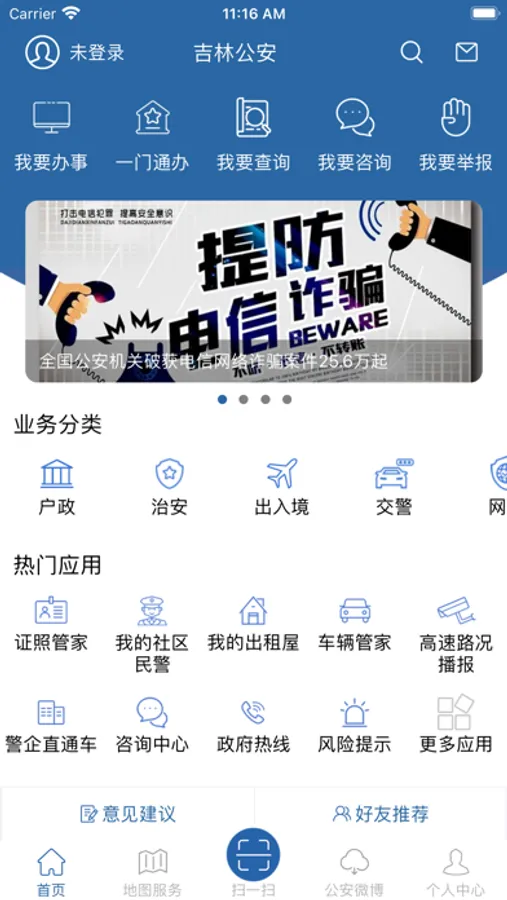 公安移动门户是吉林省公安局面向市民唯一的、权威的、官方门户,是吉林公安网络媒体和移动新媒体平台高度融合的体现,以"点线面沟通、纵横向交错、全警种覆盖、各部门联动、全民化参与"的互动方式,体现了吉林公安局的四大创新举措:"网上办事的终端延伸"、"市民可以随时随地办公"、"三大新闻形态的整合"、"移动警情的自动化管理", 建立更加适应群众需求的新媒体阵地,推出了一些市民群众日常办公生活经常使用的特色应用,如:快撤理赔、堵路移车、新闻资讯、违章查询、路况播报、办事事项等,群众借此多了一份对公安机关的了解,警民之间多了一座沟通的桥梁,公安机关的工作和主流价值观也才能更多地受到百姓的认同,获得群众的支持!