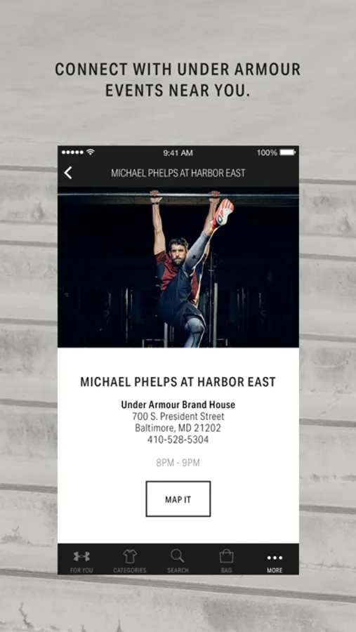 CONNECT WITH UNDER ARMOUR EVENTS NEAR YOU. Be the first to know about athlete appearances, UA events, in-store offers, and more when you use the UA Shop App. Join us at a Under Armour Brand House or Factory House, and experience UA online, in-store, and beyond.