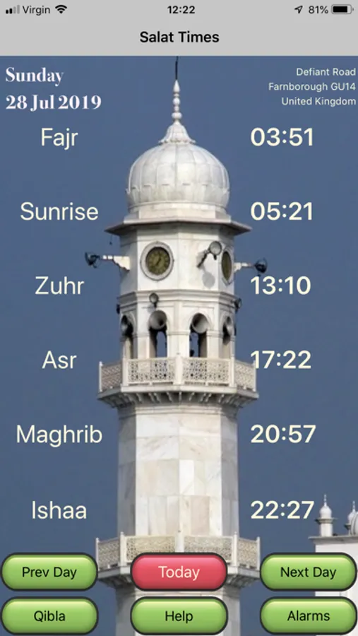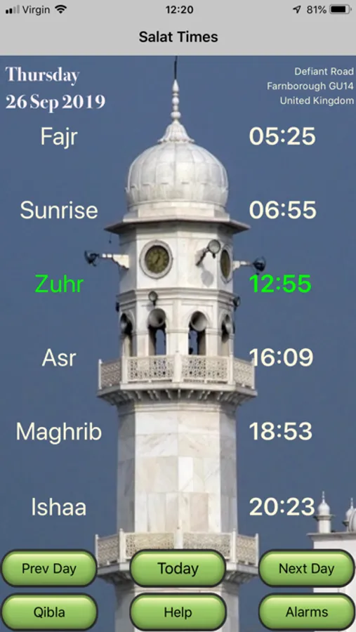 Large Salat times makes it easy to read and the next Salat time is highlighted in green colour.