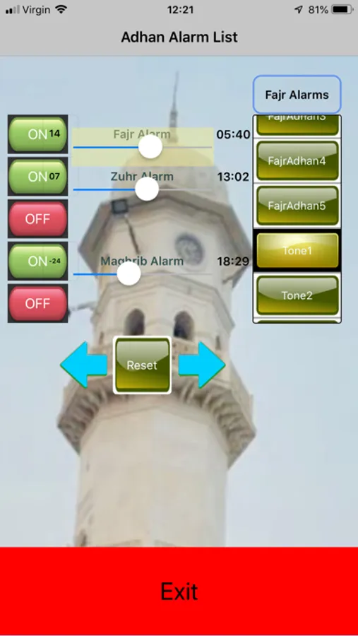 Each Salat's alarm time is set by adjusting it's slider.