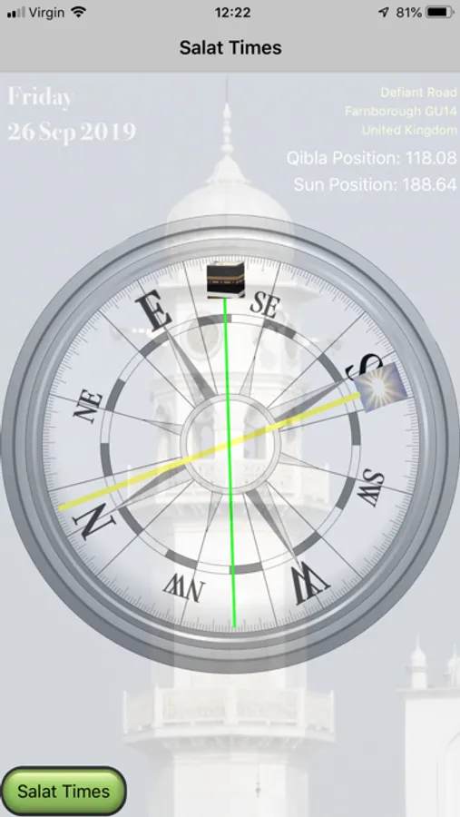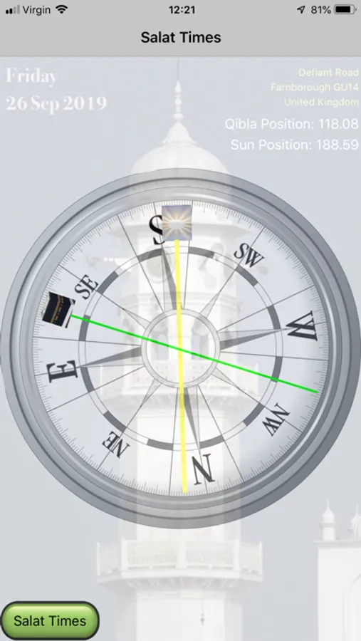The Salat times of the 5 daily prayers are calculated for the location obtained by your GPS. Also calculates the Qibla direction relative to true north and also relative to the sun.
