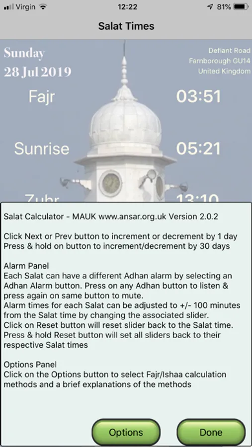 On the Adhan Alarm screen a click on the reset button will reset the active adhan slider time to mid point (i.e. at salat time). A press and hold on the reset button, sets all the 5 adhan slider times back to mid point. Listen to the Adhan by clicking on an Adhan Alarm button. Mute the sound by clicking on the same Adhan Alarm button.