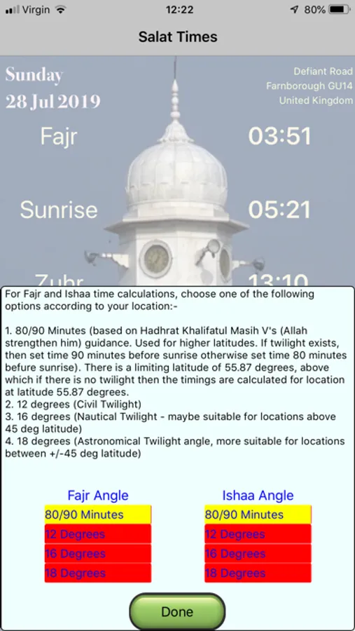 The user is presented with 4 user options for Fajr and Ishaa calculation methods. The 80/90 Mins option has been developed under Khalifatul Masih IV (may Allah strengthen him) instructions that if in a location there is twilight, then Fajr angle is 90 minutes before sunrise. If there is no twilight then set the Fajr angle as 80 minutes before sunrise. There is a limiting latitude of 55.87 degrees, above which if there is no twilight then the timings are calculated for location at latitude 55.87 degrees.