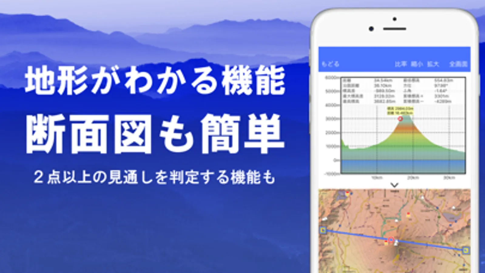 地図上で任意の点を通過する断面図を簡単に描けます。