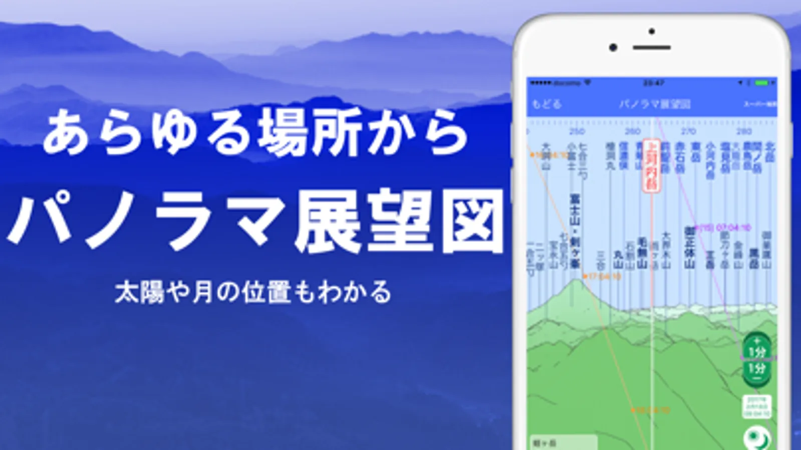 地図上のどこからでも、山の名前がわかる、パノラマ展望図を表示できます。360度のパノラマで、スマホのコンパスに連動できます。太陽や月(月齢含む)を表示できます。ダイヤモンド富士やパール富士の探索に使えます。
