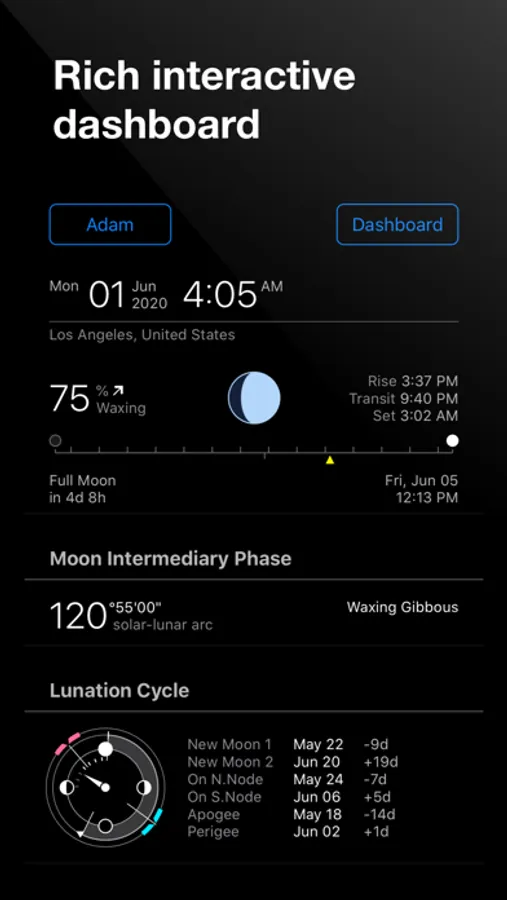— Dashboard with phases of the Sun, the Moon, retrograde planets, Moon Void of Course, solar return, lunar returns, lunar month, solar-lunar arc, etc.