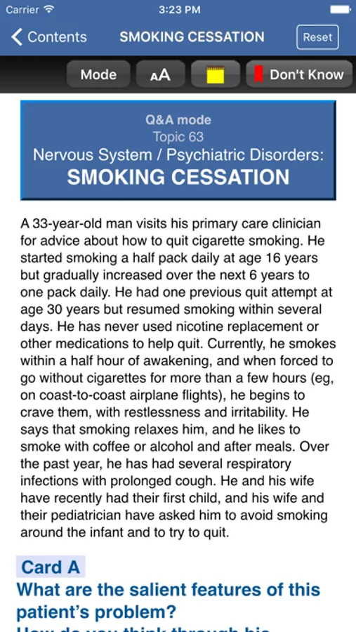 This app is very intuitive and easy to navigate, allowing you to browse the contents or search for topics. The powerful search tool gives you word suggestions that appear in the text as you type, so it is lightning fast and helps with spelling those long medical terms. The search tool also keeps a recent history of past search terms so you can go back to a previous search result very easily. You have the ability to create notes and bookmarks to enhance your learning. You can also change the text size for easier reading. Your progress on each card is tracked so you can pick up right where you left off. You can also change the text size for easier reading.