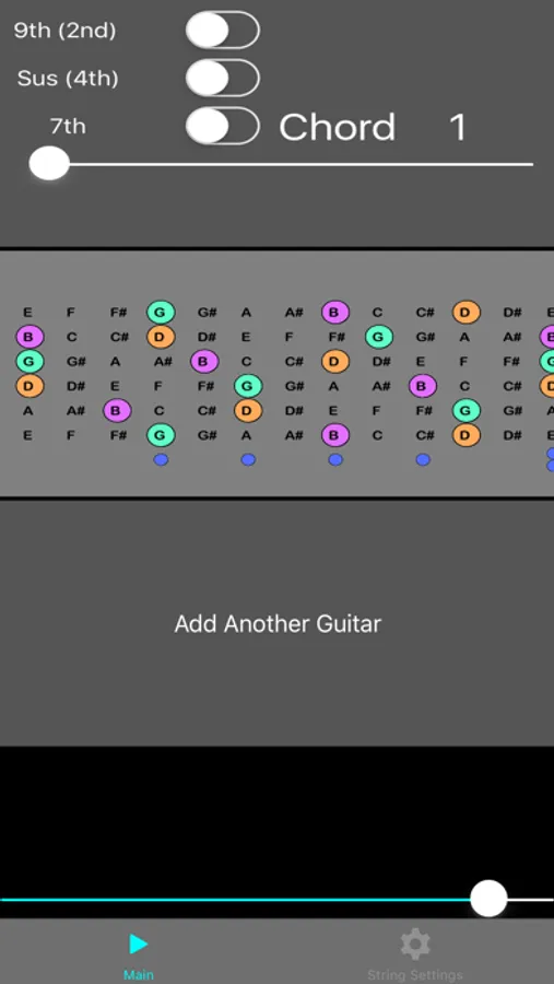 The Chordstructor feature allows you to CREATE new chordshapes!!! Play around with new chord voicings, new chord shapes, available at your fingertips! Thats not all! These chords include 7 Chords, 9 Chords, Sus(4) Chords, all following the Global Key setting! This allows you to play new chords on the fly in different keys all just by changing the Global Key!