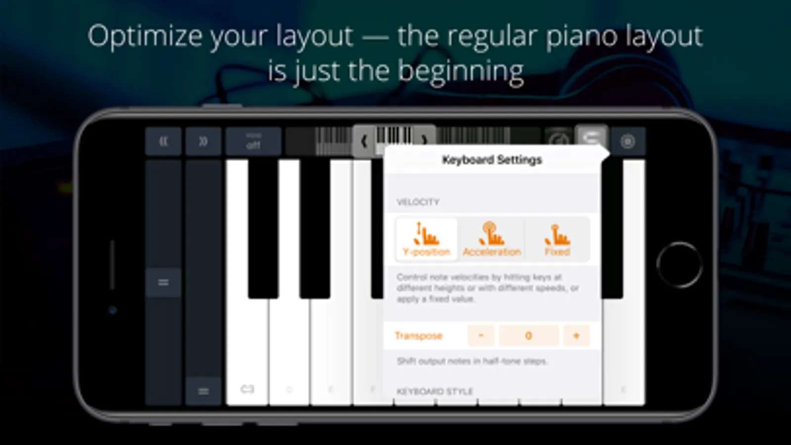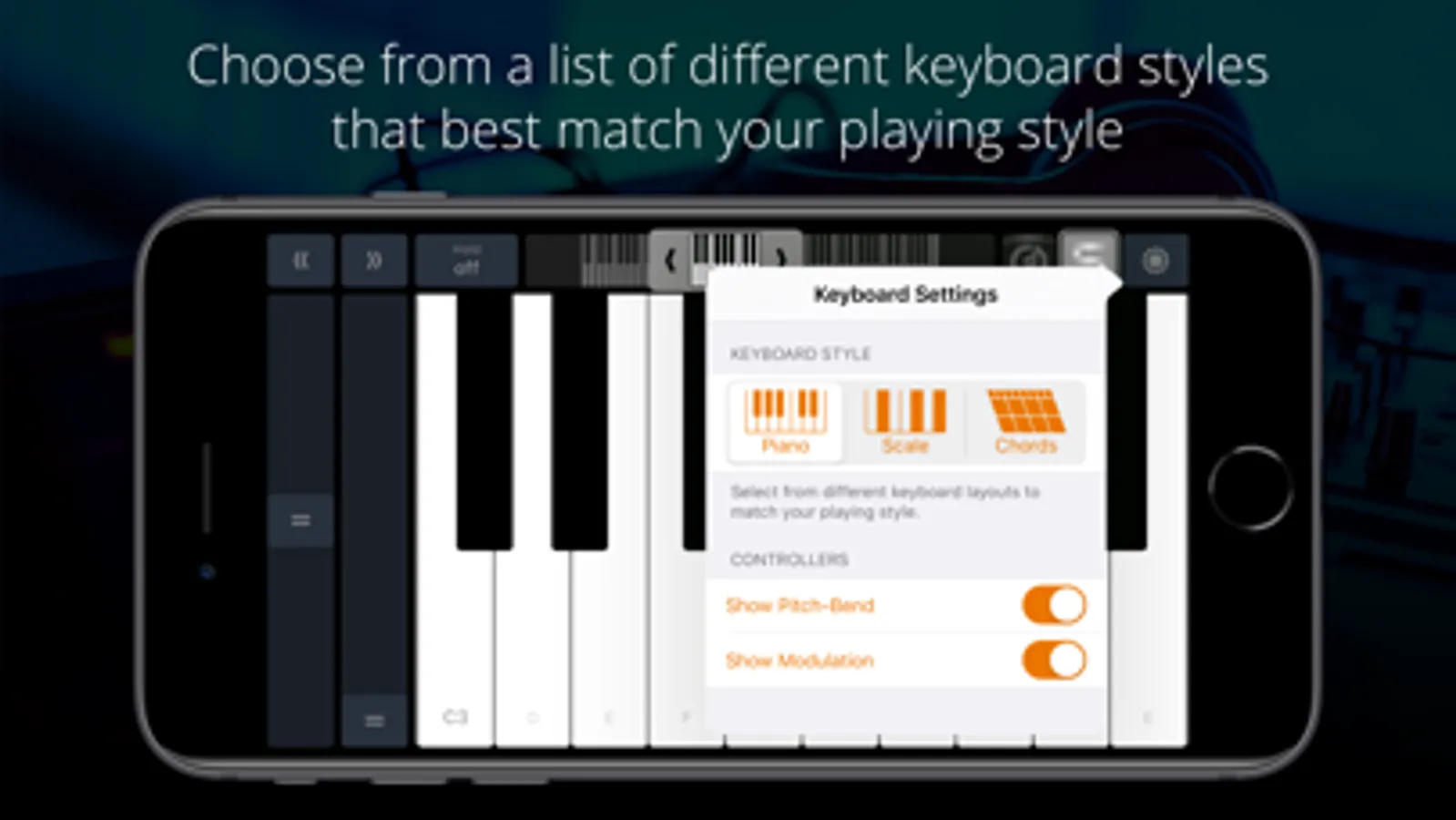 Choose from a list of different keyboard styles that match your playing style best. The regular piano layout is just the beginning. You can select from a list of scale layouts to explore their different sounds and play solos without ever hitting a wrong note. Screen space is valuable – hide the pitch-bend and/or modulation wheel if you don't need them, making more space for keys.