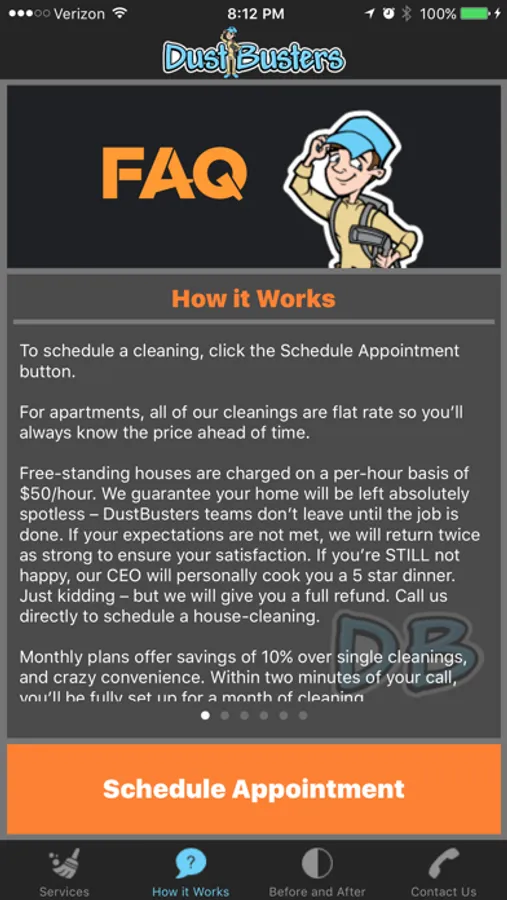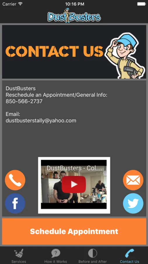 Now you can easily schedule your cleanings with our new convenient DustBusters app. Find an available day, pick a time and place and you're good to go! *Note that appointments must be scheduled at least 24 hrs in advance*