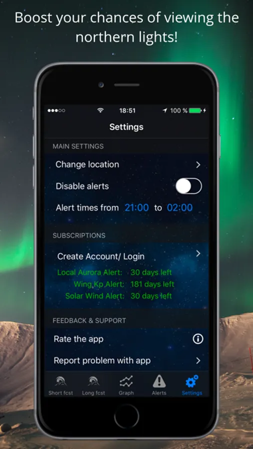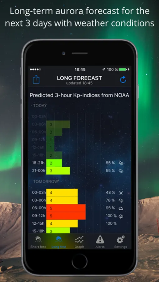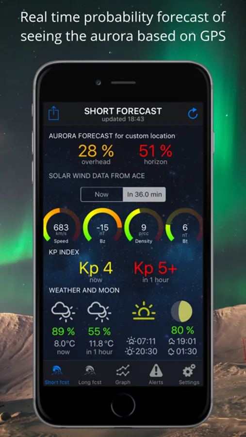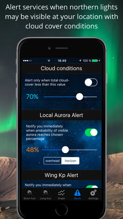 Aurora Alerts is an app designed to monitor real-time auroral activity and push alert to let you know if there may be aurora borealis (northern lights) visible tonight. Whenever you are home or away, Aurora Alerts will notify you if the possibility of seeing the northern lights exists.