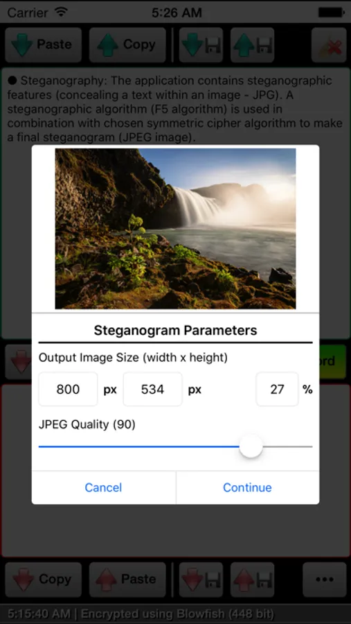 • It also includes steganographic features, allowing you to conceal text within a JPG image. This is achieved by using a steganographic algorithm (F5 algorithm) in conjunction with the chosen symmetric cipher algorithm to produce a final steganogram (JPEG image).