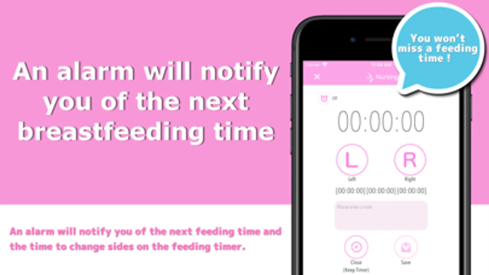 An alarm will sound at the next nursing time so you don’t forget.