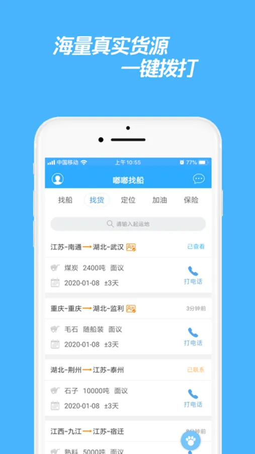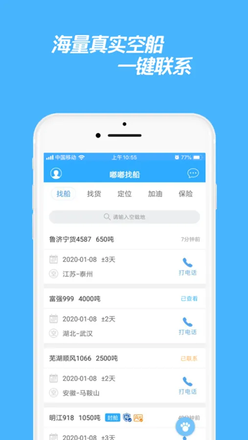 【船货预约】每天更新海量空船、货源,覆盖长江全线、运河及其它内河,一键拨打电话。