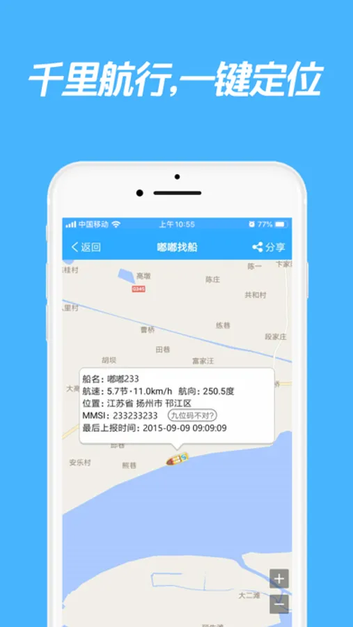 【船舶定位】输入船名即可实时定位船舶位置,查看船舶历史航行轨迹。