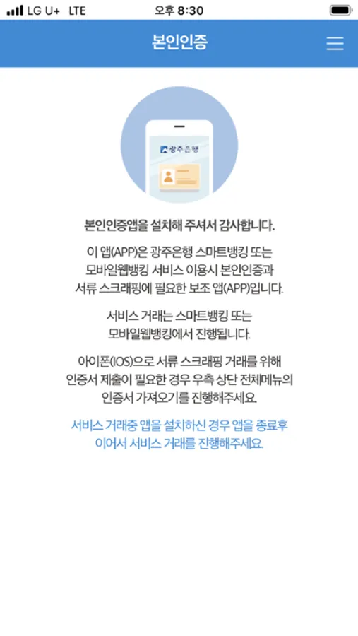 광주은행 비대면 상품가입 및 전자금융 가입 등 금융 서비스를 이용하기 위해 보유 은행 계좌확인, 신분증 사본제출 및 영상통화 등 스마트폰으로 쉽게 이용할 수 있는 비대면 본인 인증용 어플리케이션 입니다.