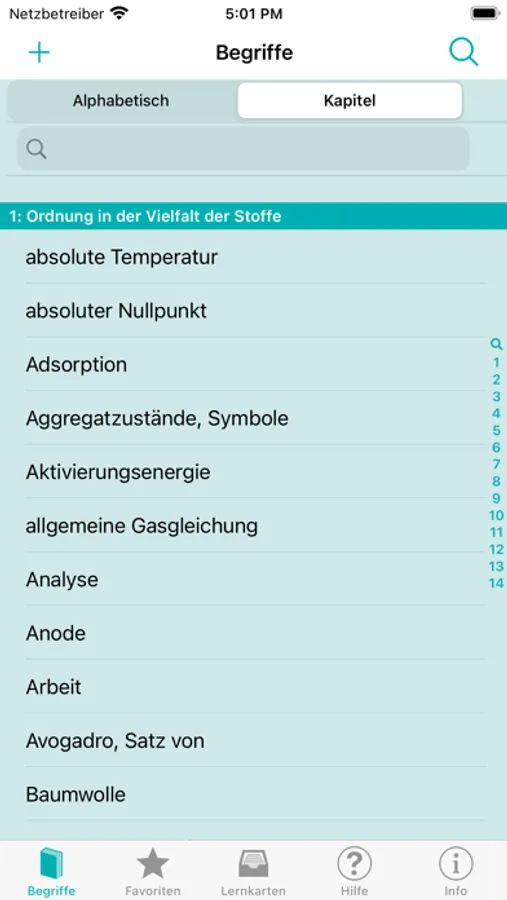 Diese App basiert auf dem Lehrmittel «Chemie für die Berufsmaturität» von Günter Baars aus dem hep verlag. Sie enthält alle Begriffsdefinitionen des Glossars aus dem Grundlagenbuch (Band 1) und dem Ergänzungsband (Band 2) – alphabetisch und nach Kapiteln geordnet.