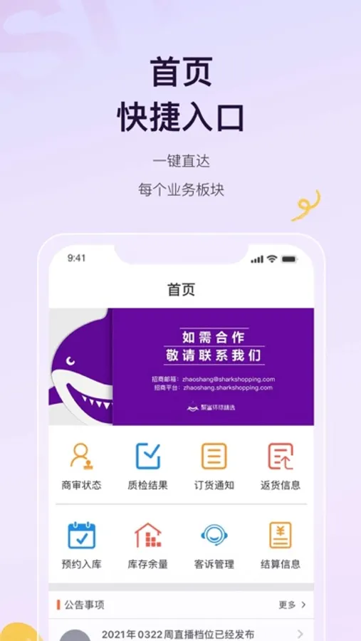 聚鲨环球精选供应链SCM系统APP客户端,可以查询商品商审及质检状态,查询一天前的节目销量,查看顾客订单配送情况。同时可以下载订货单、返货单,下载及打印商品物流码,并与仓库进行预约入库,还可随时掌握在库商品的余量。另外还有客诉管理、结算对账等便利功能,方便您随时处理和提交客诉进度、进行简单的查账、对账。