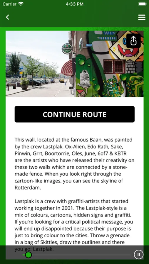 Rewriters gives you background information on each of the murals, shows you the newest murals to appear in the city, and informs you about notable works that have disappeared throughout the years. The information is available in Dutch and English, in spoken and written form. Each route can be saved offline, so you can enjoy your guided tours without using an internet connection and data usage.