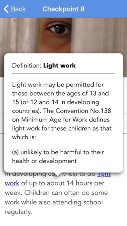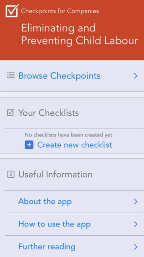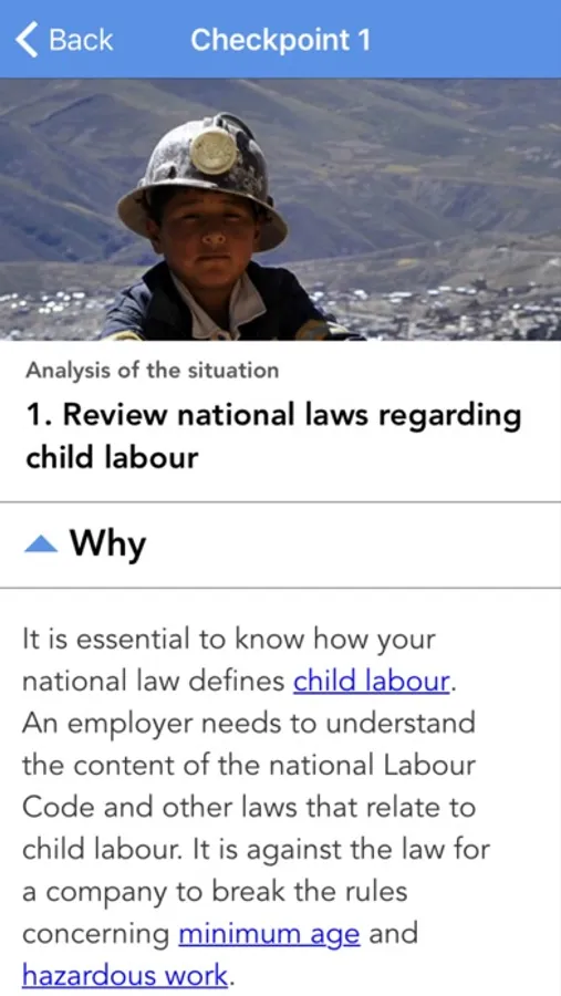 Eliminating and Preventing Child Labour - Checkpoints allows business managers and auditors to create interactive checklists that will help them ensure a child labour-free operation. There are 18 checkpoints in total. Each checkpoint provides best-practice recommendations for taking action.